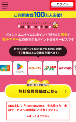 ポイントエニタイムの公式サイトにアクセスし、画面右上にある「ログイン」ボタンをクリックします。