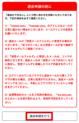 確認できたら、「退会に関する全ての内容に承諾し退会申請」にチェックを入れて「退会申請を行う」をクリックします。