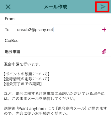 「すべての項目に承諾し退会を申請する」をクリックすると、自動的に端末のメールソフトが開かれます。表示された退会申請メールは、内容を変更せずにそのまま送信しましょう。