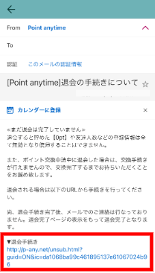 退会申請メールを送信すると、ポイントエニタイムから退会手続きに関するメールが届きます。