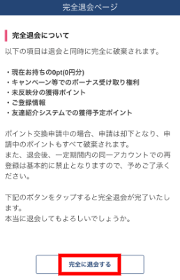 URLをクリックすると「完全退会ページ」が開かれるので、最終注意事項を確認したうえで「完全に退会する」をクリックします。