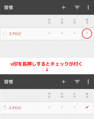 習慣を保存したら日付と×印が表示されます。習慣を実行したら×印を長押ししましょう。チェックマークが付けばその日の習慣は達成です!