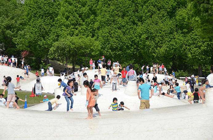 園内のちょうど真ん中にある"みんなの原っぱ"は、なんと東京ドームが2つまるまる入る約11haという広さ!