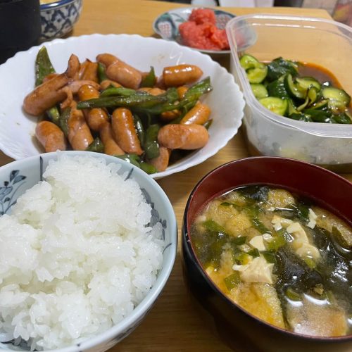 ↑写真奥から明太子、ソーセージとピーマンの醤油炒め、キュウリの中華風和え物