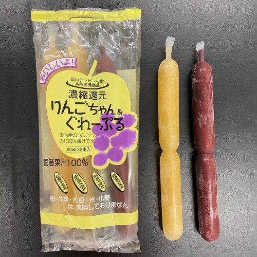 大トリを飾るのは、こだわりやで購入した岡山アトピーの会共同開発商品の「濃縮還元りんごちゃん&ぐれーぷる」です。