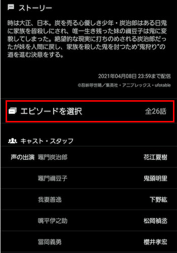 2. 作品紹介ページ内の「エピソードを選択」をタップする
