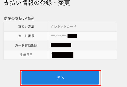 - 支払い方法の登録・変更の場面で「次へ」を選択する